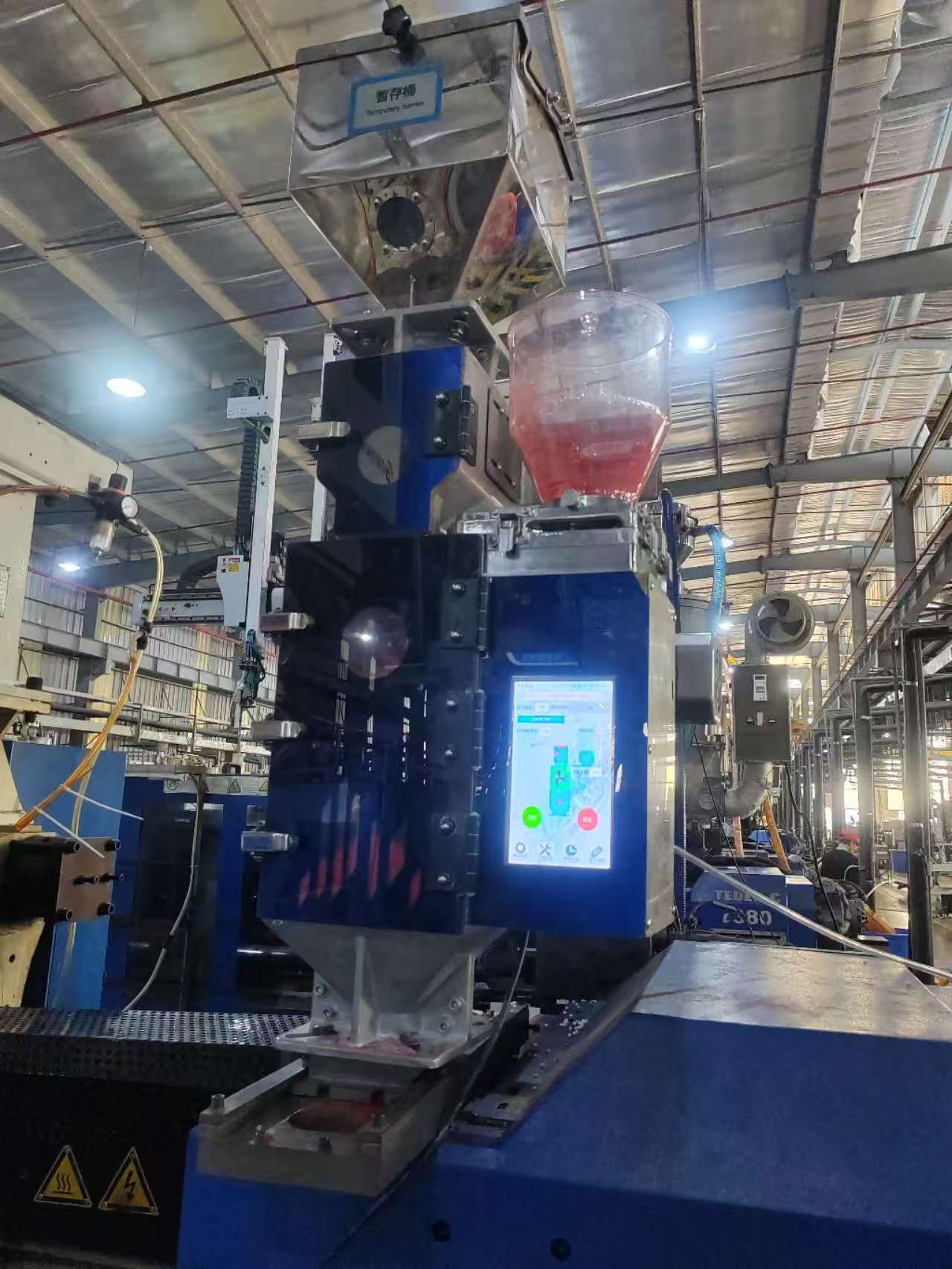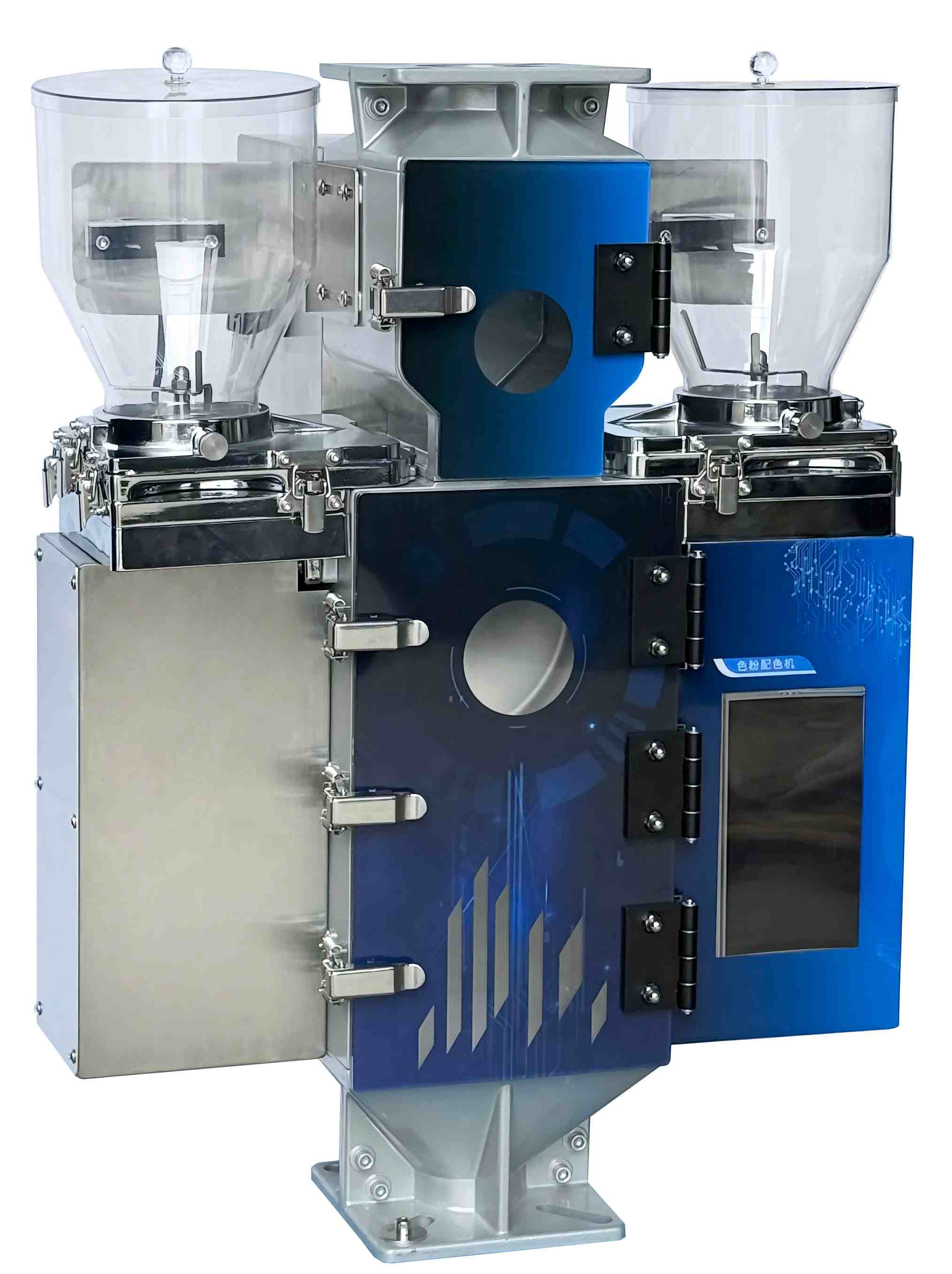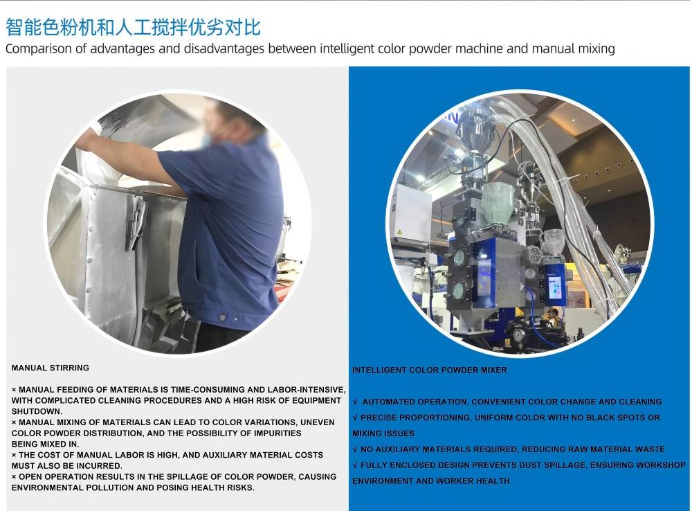 100 кг/ч„Интелигентното смесване на цветен прах“ може да се интегрира безпроблемно с централизирани системи за подаване, централни транспортни системи и автоматични системи за обработка на материали. Пластмасовият цветен миксер е оборудван с високопрецизни сензори за претегляне, които гарантират еднородността на процеса на смесване и консистенцията на цвета и поддържат автоматично дозиране на многокомпонентни прахове и добавки.
